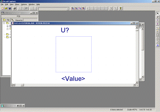 We will be making a symbol for the Xilinx XC9536 PLD. This part comes in a 44-pin PLCC package. Name the part XC9536-PLCC44. Leave the Part Reference Prefix as U[1]. You can leave the default values for all the other settings. Click OK to bring up the workspace for part creation. It should look like the picture below. Tools for working with the part are located on the toolbar on the right-hand side of the screen.