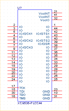Refer to the part datasheet for the correct pin numbers for the PC44 package. You can either download the datasheet from the Xilinx web site (www.xilinx.com) or from Owlnet at the following location.