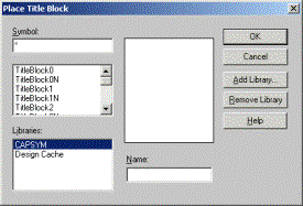 Open page 1 of your schematics by double-clicking it in the project window. This will bring up a blank page. Before we place parts, let’s do a couple of things. First, I like to make the page size a bit bigger than the default. You can fit a lot more onto the page and it will still look nice when printed. To do this select OptionsàSchematic Page Properties… Click the Custom radio button and use the following values (width=15.2, height=11.5). Second, there is a title block in the lower right corner. We are going to replace this with our own, so highlight the title block and delete it. We add a new title block by selecting PlaceàTitle Block… You will see the following dialog box.