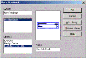 The title block is in your library, so we need to add that to the list of libraries. Click the Add Library button to browse to and select the library you created for the tutorial. Once you have added the library, you will be able to choose the RiceTitleBlock to add it to your design. Place the title block in the lower right corner of your schematic page. The title block has fields to put information for each page of schematics. Double-click the text to edit each field and change the information on each page so that it looks something like this.