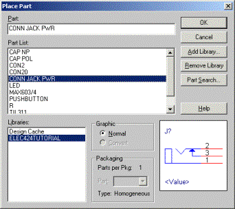 Select the part CONN JACK PWR and click OK. Place the part on the left side of your schematic page. Now place the remaining parts on both pages using the attached completed schematics as a guide. A PDF file of the schematics can also be found on Owlnet.