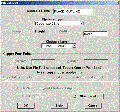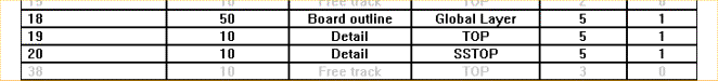 Finally, we need to add some cut lines to mark the board outline on the TOP and silkscreen (SST) layers. The board shop will use these cut lines to route out the board from a larger panel. Click View Spreadsheet and then Obstacles to open the obstacles spreadsheet. Find your board outline. It will be the only one with the obstacle type of Board outline. Press CTRL-C twice to create two copies of the board outline. Double-click one to open the Edit Obstacle dialog. Change the Obstacle Type to Detail, Width to 10 and the Obstacle Layer to TOP. Do the same with the other one, but place it on the SSTOP layer.