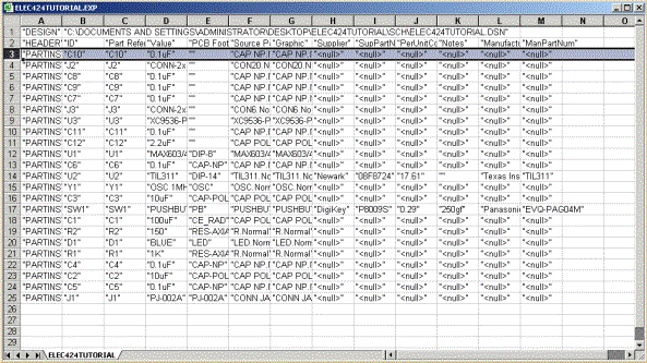 When you saved your file, Layout reminded you to back annotate. This was because we added the mounting holes to our design, and OrCAD wants to export those back to schematics. Even though it is not entirely necessary right at this moment, let’s step through the process so you know how it works. On the menu click AutoàBack Annotate. OrCAD will create a swap file called Elec424Tutorial.swp in your board directory. It is safe to overwrite your existing board file with the new one. Look at the swap file in Notepad. You will see several sections. One thing that Layout does is update part and net properties (such as its coordinates) in Capture. If new components were added, then you would also see those changes. Now let’s import this file into Capture. Start Capture and highlight your dsn file. Select ToolsàBack Annotate… You can leave the Scope and Mode settings untouched. Use the Browse button to find your swap file. Click OK to start the update. Occasionally, when you add components like mounting holes, you will get an error during back annotation. This is usually safe to ignore.