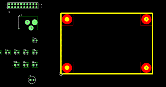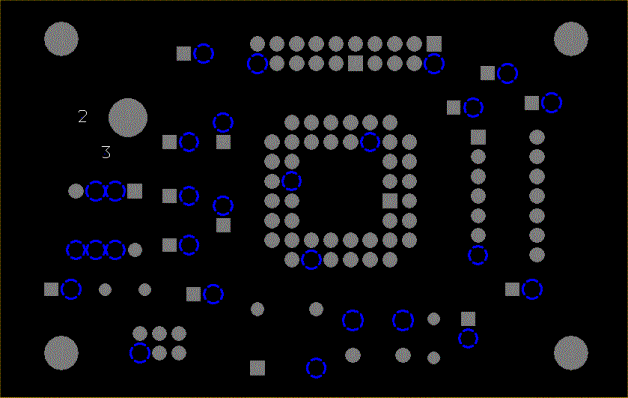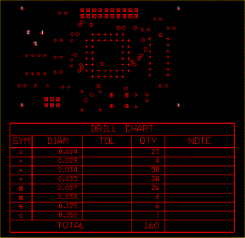 E. Drills – Drills require some special attention. First, you need to fix the error you got earlier about the drills. This error occurs sometimes after you perform an ECO. To see the problem, make the Drill Drawing (DRD) layer visible. Press Backspace to clear the display and then Shift-5 to display just the DRD layer.