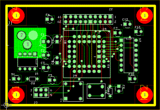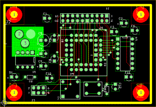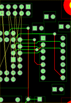 You now have your first complete route. You can begin to finish the other connections. Start by routing one component at a time. For example, you might route the TIL311 next, as is shown above. It is also important to route critical signals first, such as clocks and resets. Remember that you can zoom and pan during operations such as routing. The DRC routing box will move with you. With the current DRC settings, you may sometimes see circles around your traces if you get too close to another net or pad. If this happens, then Layout is warning you that you are making a spacing violation with your route. You will need to fix it. I would also suggest that you browse the shortcut keys in the help to see which shortcuts will be useful during routing. When you are done routing, your design may look something like this.