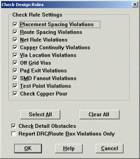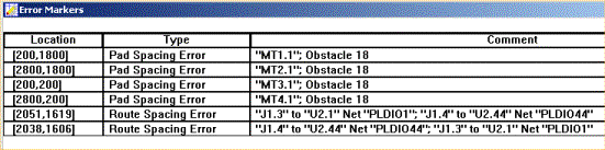 You can remove the errors by moving the trace back to its original position. Once the error has been corrected, you can delete the marker from the errors spreadsheet. Do not try to use the AutoàRemove Violations tool. It is tempting, but it will actually rip up offending traces and move parts. You will end up having to do a lot of cleanup and rerouting after using this tool.