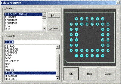 Once you have made a change to a footprint, and now you need to update the footprint in Layout. Open the components spreadsheet and find the PLD. Double-click to bring up the Edit Component dialog box. Click the Footprint button to show the Select Footprint dialog.