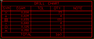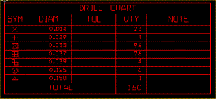The DRD layer is a documentation layer that contains a chart with all your drill sizes and their locations on the board. The problem is that two drills are using the same symbol. In this case it is the 14 mil drill and the 150 mil drill. To fix the problem, click View Spreadsheet and select Drills to view the drills spreadsheet.