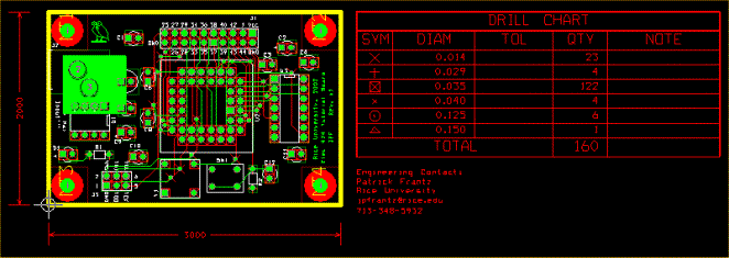 We also need to add a few things to the Drill Drawing layer. It is customary to provide board dimensions and engineering contact information on this layer. Make the Drill Drawing layer visible if it is not already. First move the drill chart to the right of the board by selecting ToolàDrill ChartàMove Drill Chart from the menu. Next, add dimension lines using ToolàDimensionàNew. Your board should measure exactly 3000 mils by 2000 mils. Now use the Text Tool to add some text with your name, phone number and email beneath the drill chart. When you are done everything should look like this.