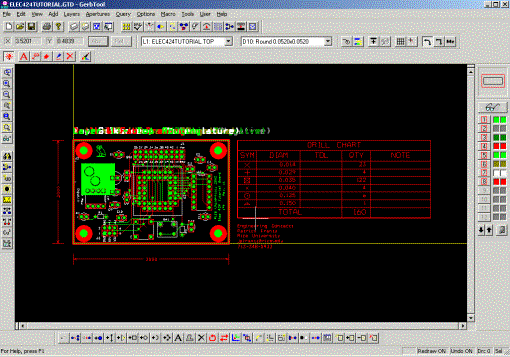 8.10 Viewing the Gerber Files – Before submitting your Gerber files for fabrication, it is best to look at them in a Gerber viewer. You will often catch mistakes there that you don’t see in layout. OrCAD has a built in Gerber viewer and editor called GerbTool. This is actually a very powerful program that you can use to edit the Gerber files, but you will just use it to look at them for now. In the main Layout window select ToolsàGerbToolàOpen… In your board directory there should be a file called Elec424Tutorial.gtd. Find this file and open it. You should see your design in GerbTool.